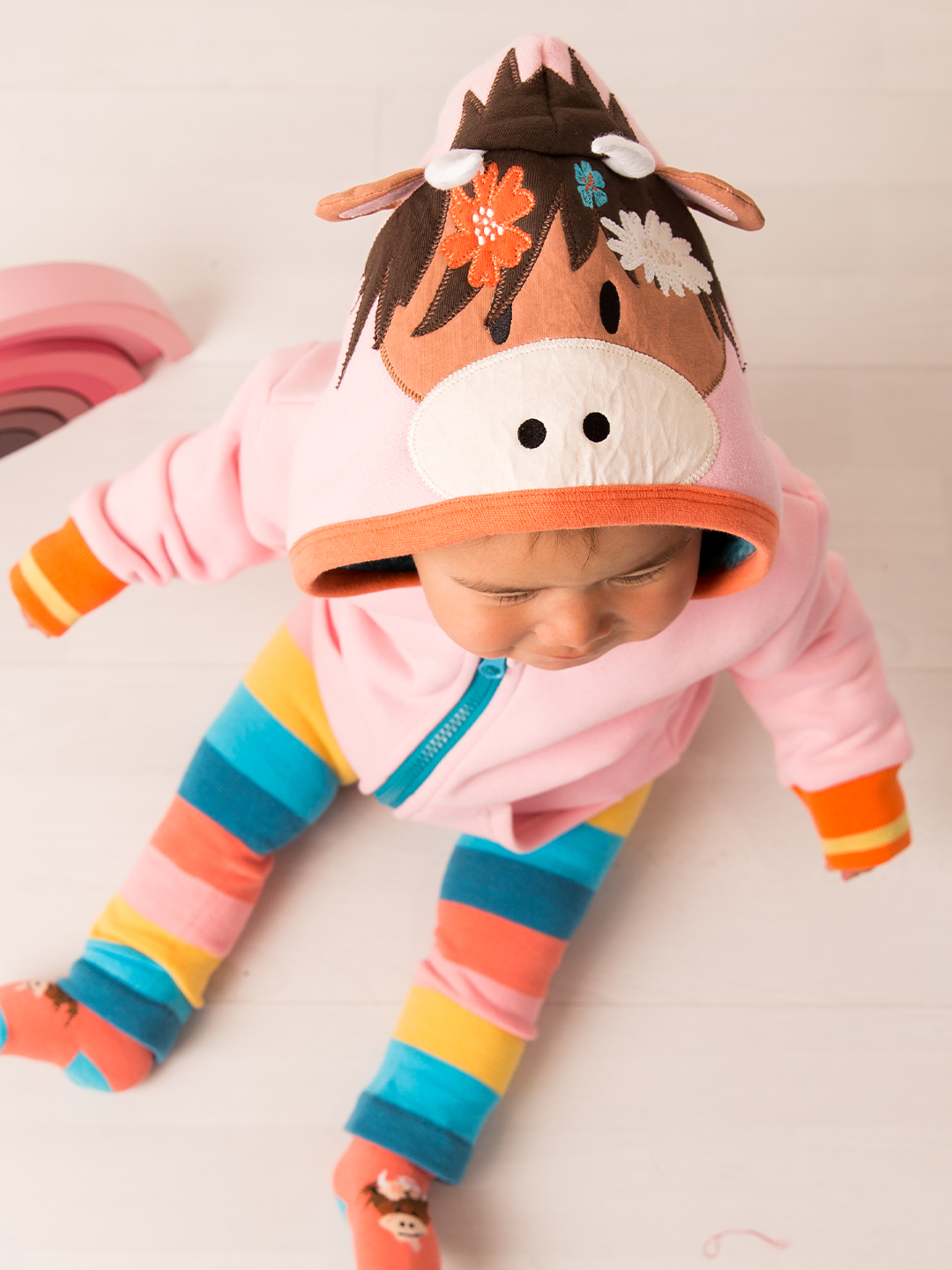 This lovely new pink hoodie features a hood with our new Bonnie Highland Cow face with perky ears and horns. Ideal if your little one likes standing out from the crowd or if they love anything nature related!
