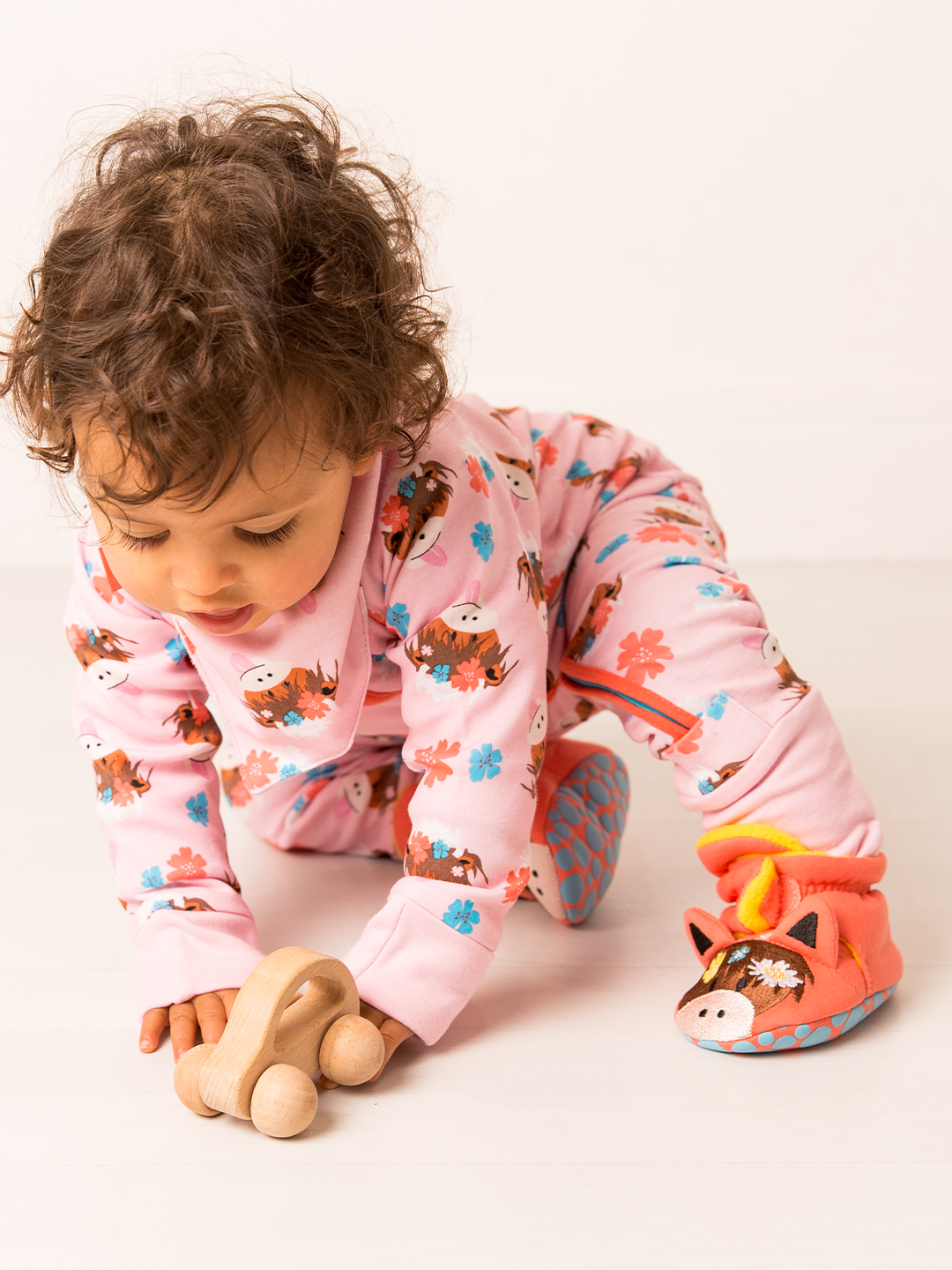 Made for moving and grooving around the house, these Bonnie Highland Cow booties make the ideal companion to the Blade & Rose Bonnie Highland Cow pieces. Keeping little ones feet warm in the colder months is important and these are a perfect pram shoe or soft first crawler footwear. They also stay on well so your little one can kick away with you safe in the knowledge they're going to keep their shoes on!