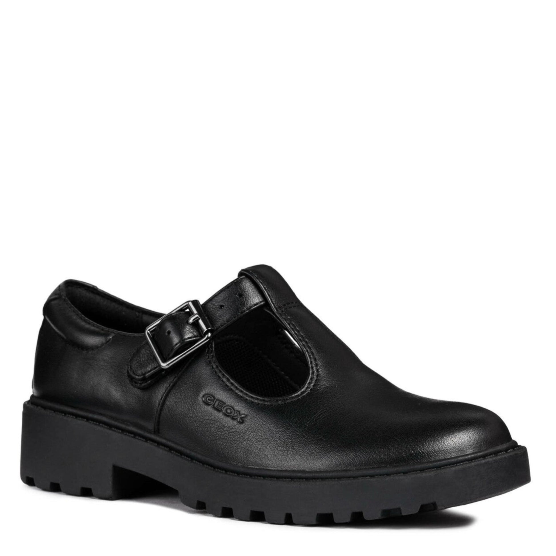 Girl's classic black leather T-bar design with eyelets on the front of the upper made from plain black leather, Casey is a breathable and exceptionally comfortable school shoe.