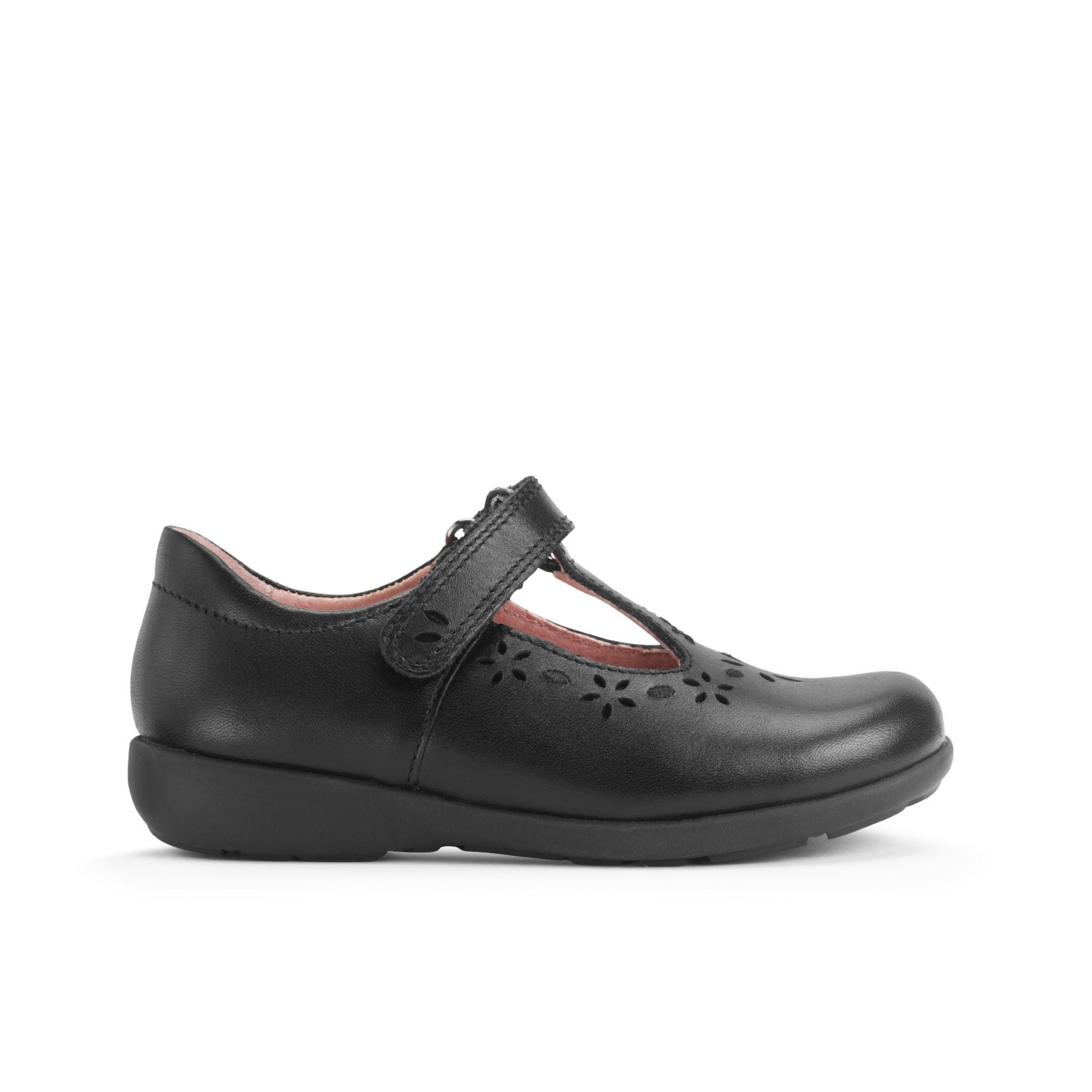 Charlotte black leather shoes are a timeless T-bar design with a pretty punched out detail, crafted for busy schooldays and active young feet. This classic style combines elegance with practicality, making it a firm favourite for parents and children alike.