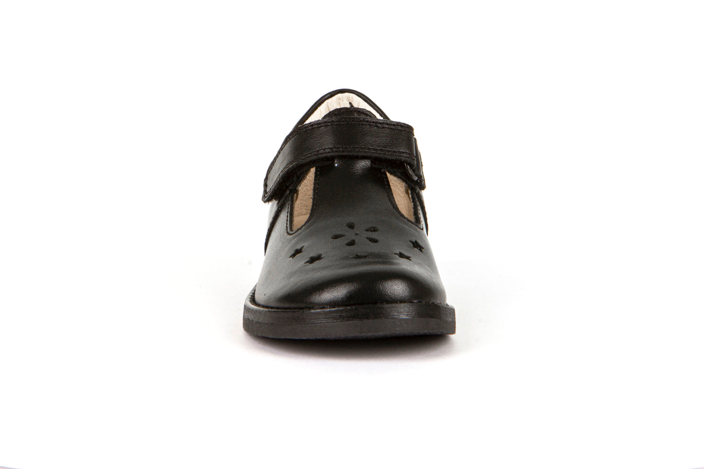 A lovely traditional T-Bar girl's school shoe made of premium leather with a riptape fastening and a traditional style sole unit reminiscent of a stitchdown. A pretty punched pattern across the front completes this classic look.