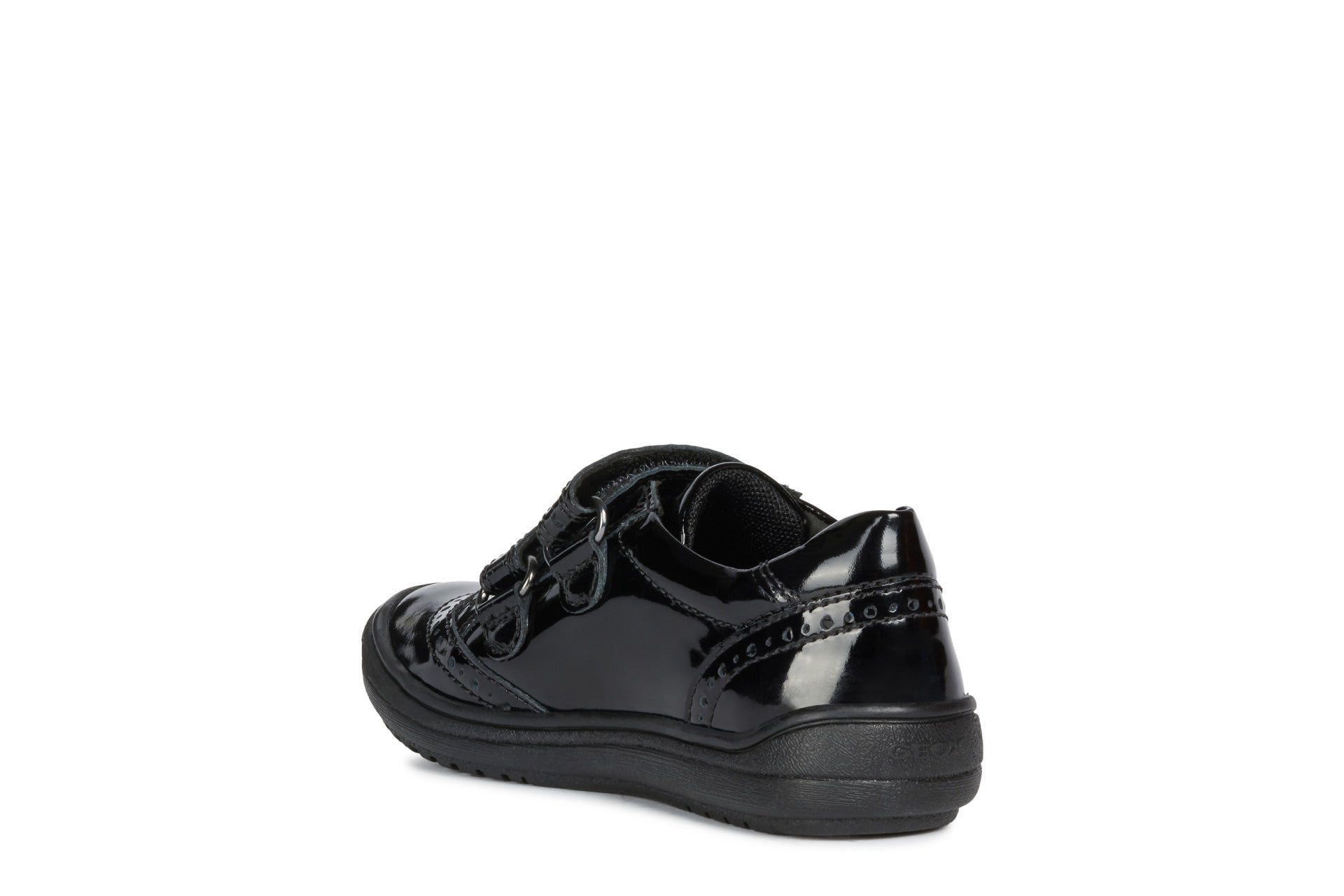 Girl’s breathable covered shoe with a feminine look, ideal for active school days. The upper in black patent embellished with brogue perforations gives it a formal, understated vibe, with a practical outsole that rises around the shoe and creates a subtle toe bumper. Hadriel is a classic shoe boasting unmatched comfort for everyday wear.