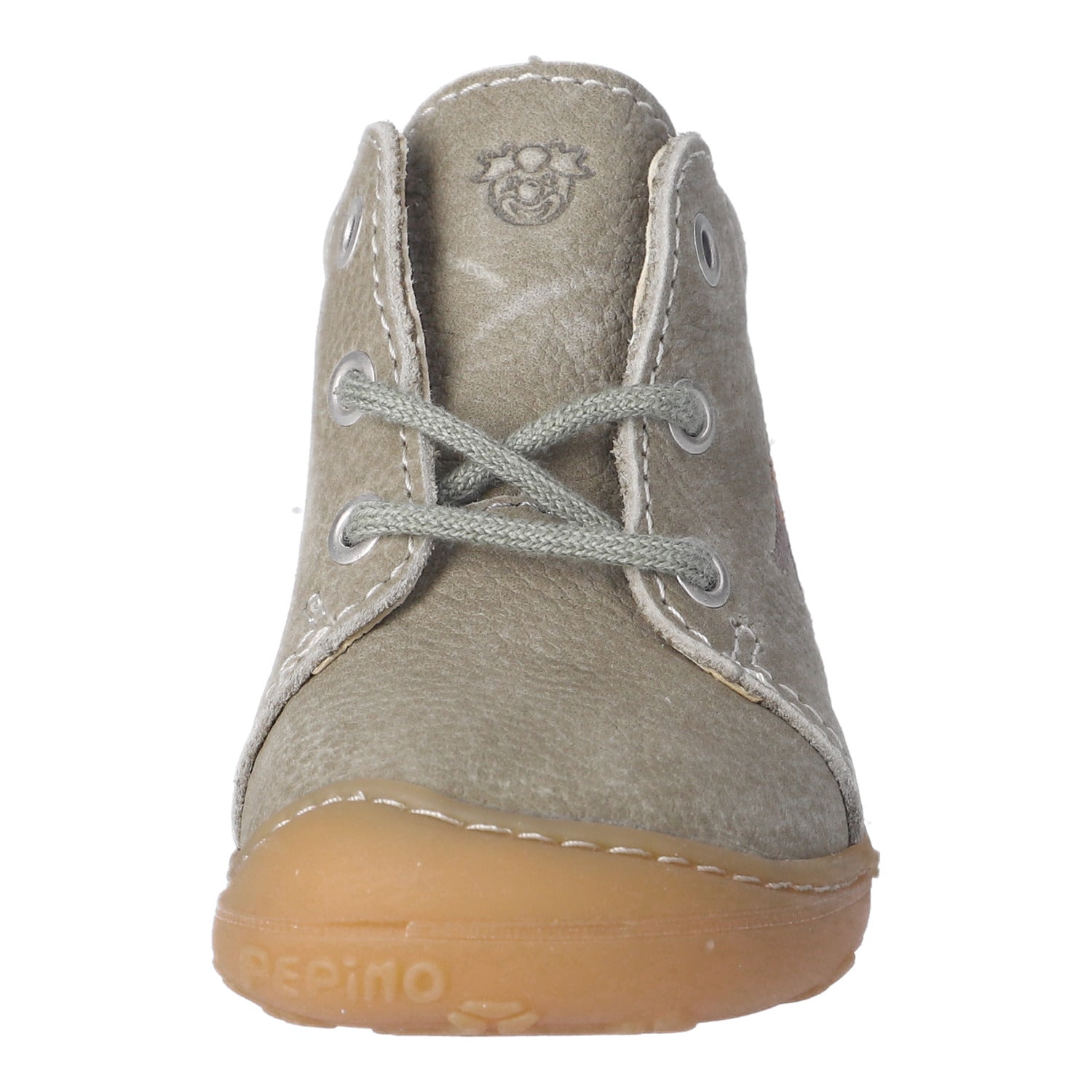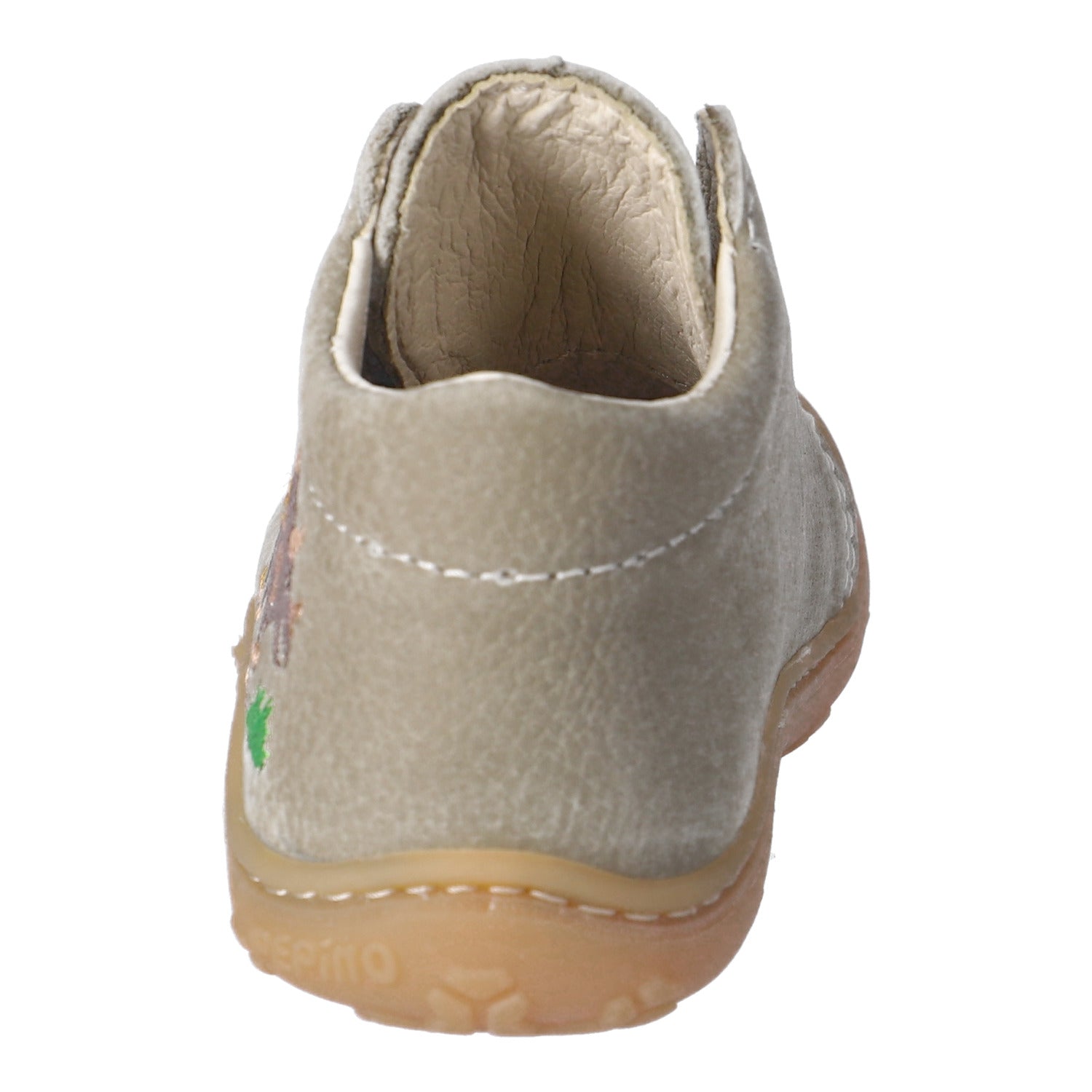 Ricosta Pepino Mecki is a soft leather first walker in a lovely soft eucalyptus green nubuk with a friendly dinosaur embroidery motif that every toddler will love. It is leather lined. It is a lace up version of our riptape fastening Chrisy, with lovely matching laces, and is perfect for first steps.