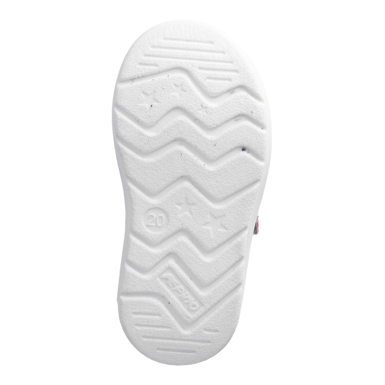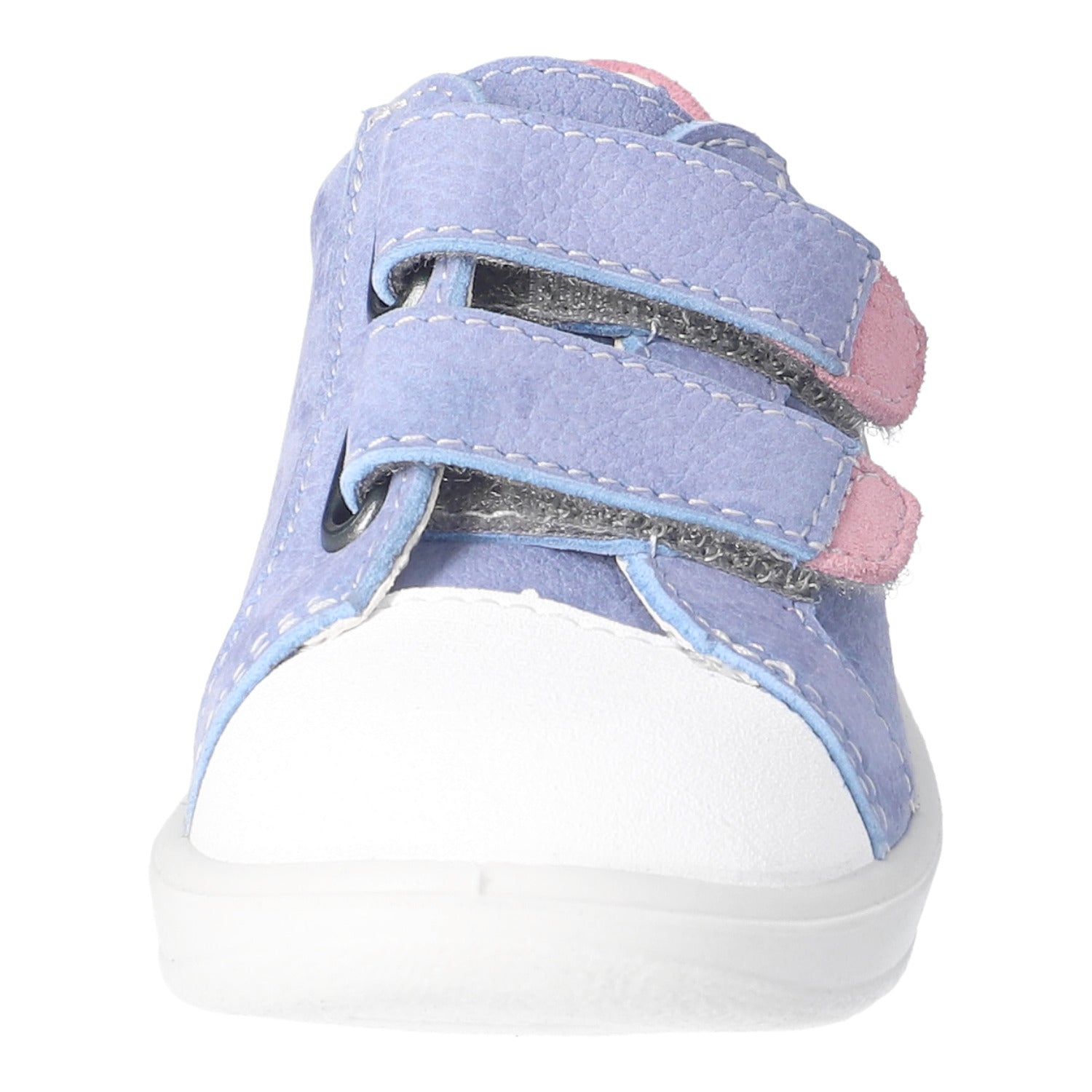Ricosta Pepino Nippy Shoe in a pale cloud blue nubuk leather with pale pink highlights. A lovely light weight cross season shoe. Nippy benefits from arch supports, cushioned sole and padded ankles for extra comfort. It has double rip-tape fastening and bumper toe protection to prevent scuffs and scrapes. The removable leather foot-bed has handy fit indicator.