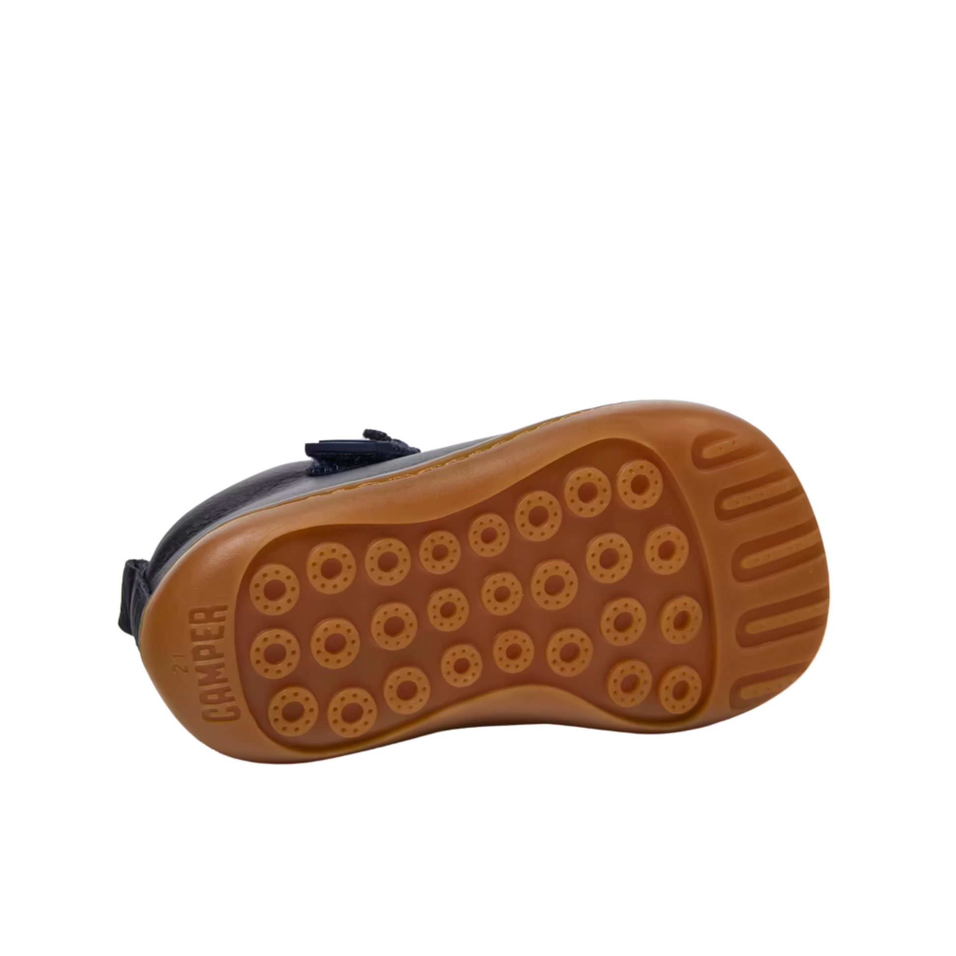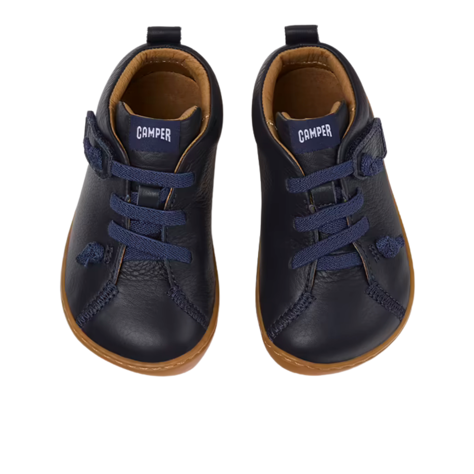 A Camper Icon that evolves with every season. Peu is functional simplicity inspired by walking barefoot. It is 360-degree stitched and built with a Strobel construction technique, guaranteeing unmatched flex and durability under any conditions.Stylish navy blue leather kids' shoes with EVA footbeds, elastic laces with hook & loop system, and recycled rubber outsoles (20% recycled).