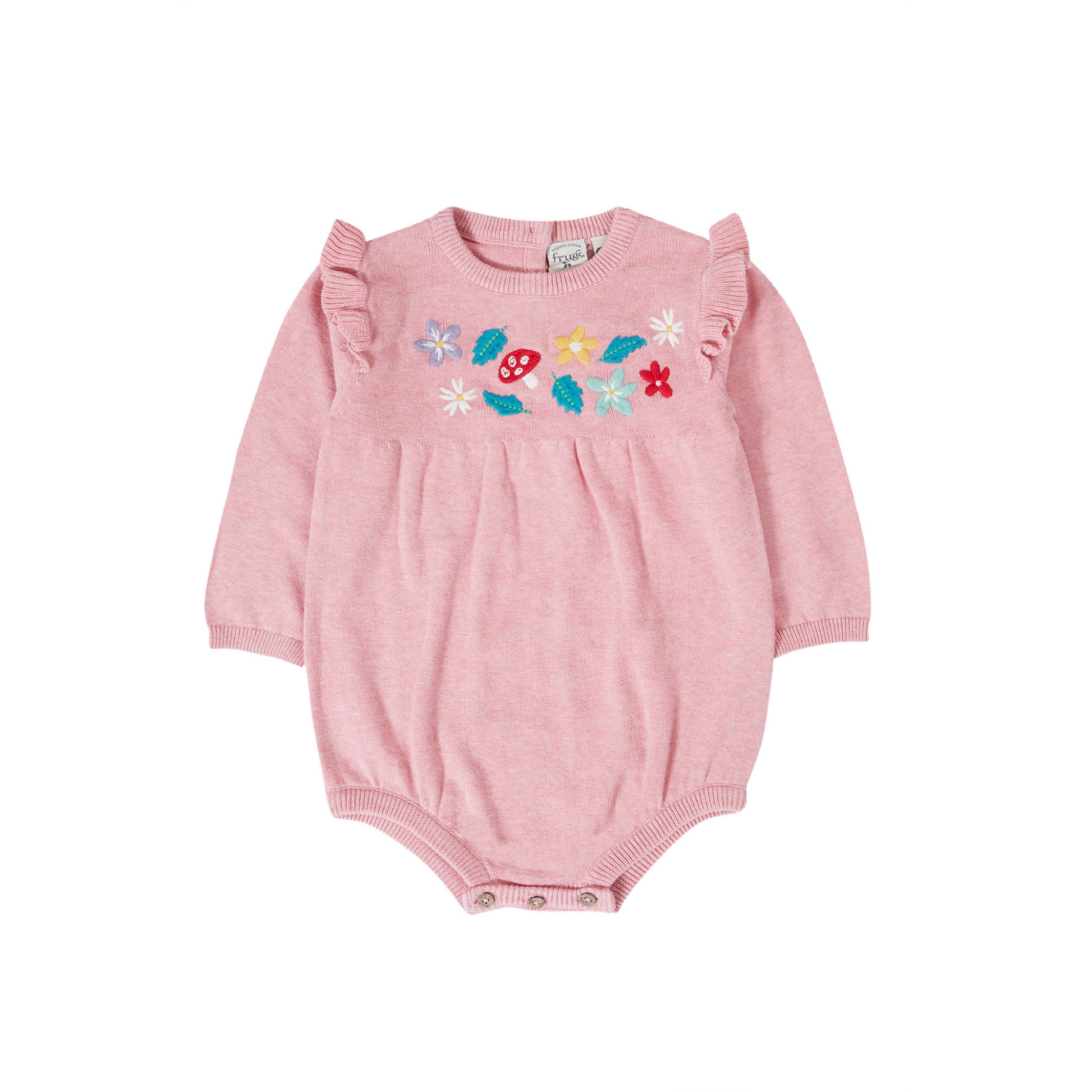 This adorable Remi Knitted Romper is the perfect gift for new additions, great for pairing with bottoms or underneath dungarees! Crafted from soft and snuggly organic cotton knit, this machine washable baby romper has pretty frilled sleeves and embroidery details, plus handy button fastenings at the back and popper fastenings underneath for easy-peasy nappy changes.