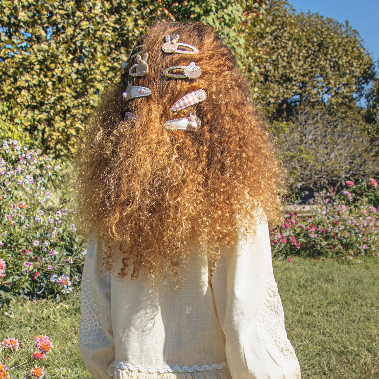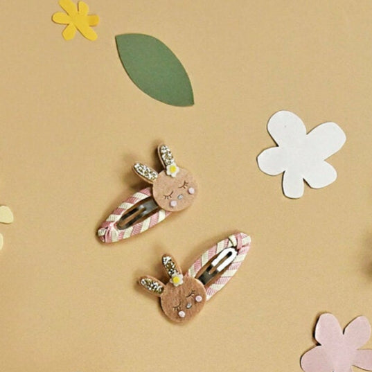 Hop into style with our adorable Stripy Bunny clips! Each tie features a charming bunny face adorned with glittery ears and a sweet daisy in her hair, and is set upon a striped grosgrain ribbon wrapped snap clip.
