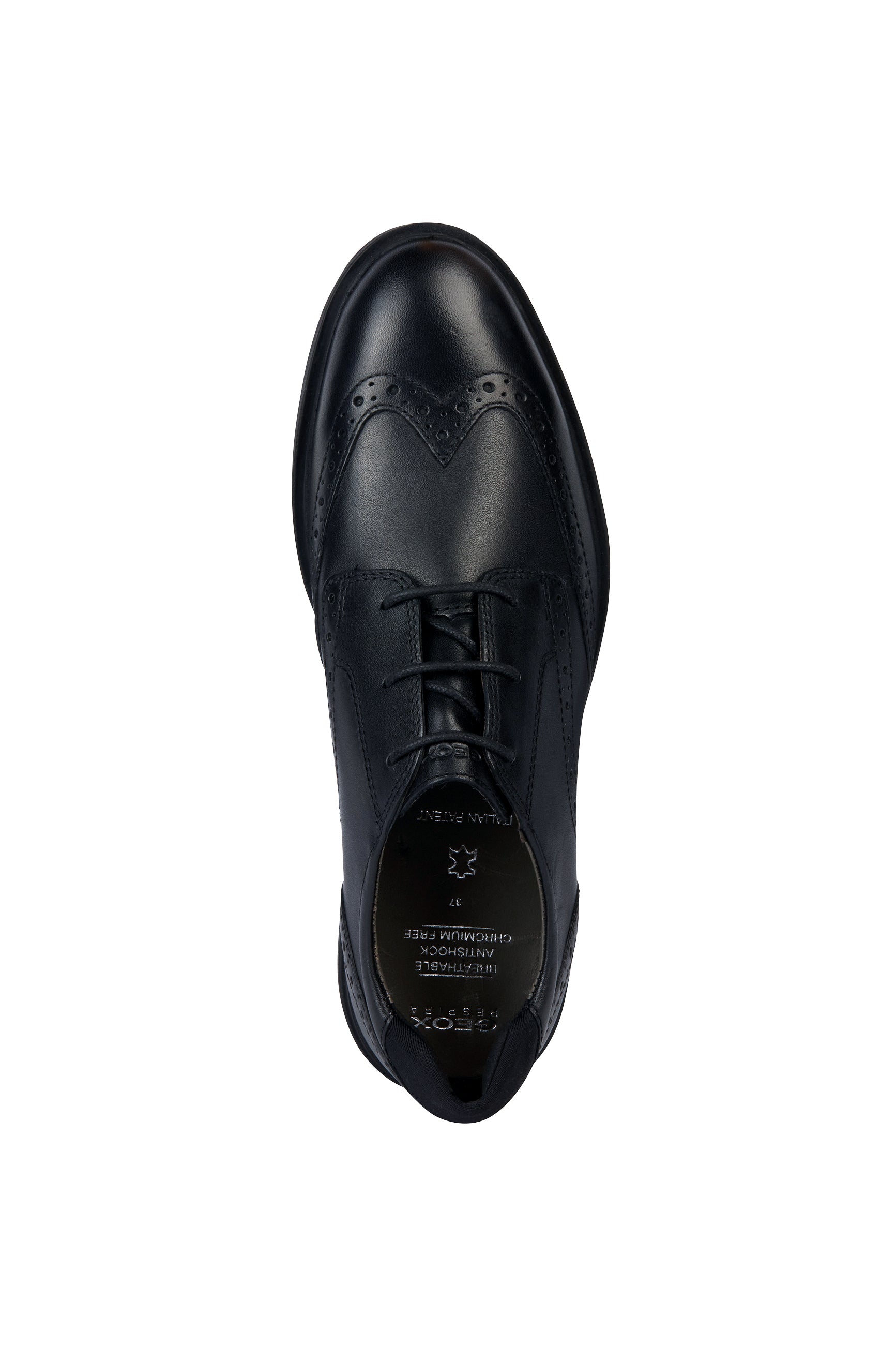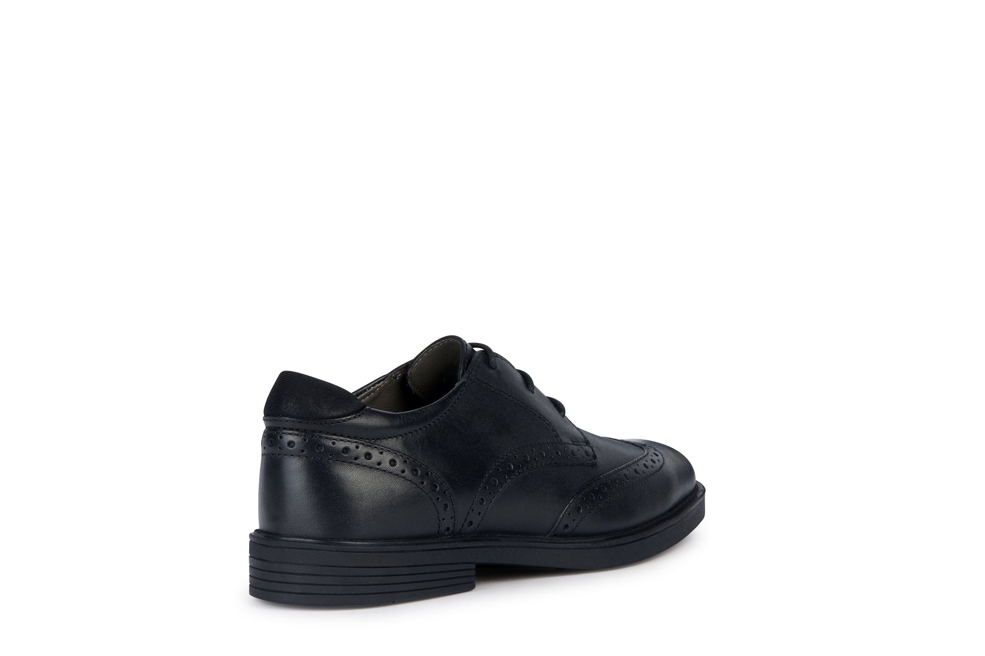 Geox Zheeno is a new black leather lace up brogue school shoe that is a unisex style that will suit girls who need larger sizes. A classic formal style brogued leather lace-up. Comfortable and durable with a padded heel collar and cushioned sole.